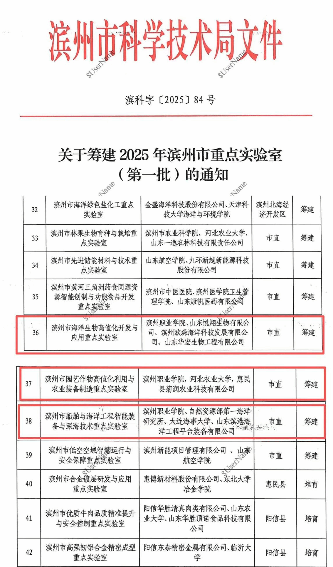 本网科研处讯 近日,滨州市科学技术局公布了关于筹建 2025年滨州市重点实验室(第一批)的通知,我校推荐的滨州市海洋生物高值化开发与应用重点实验室、滨州市园艺作物高值化利用与农业装备制造重点实验室、滨州市船舶与海洋工程智能装备与深海技术重点实验室3个实验室全部获批立项,立项率达到100%。